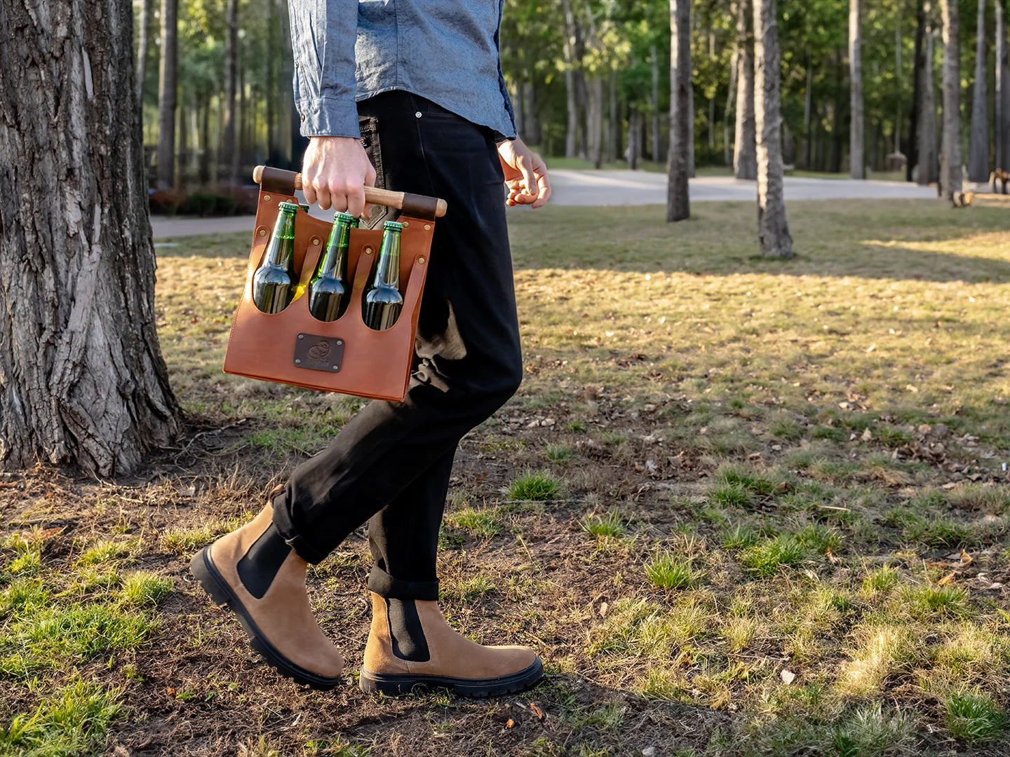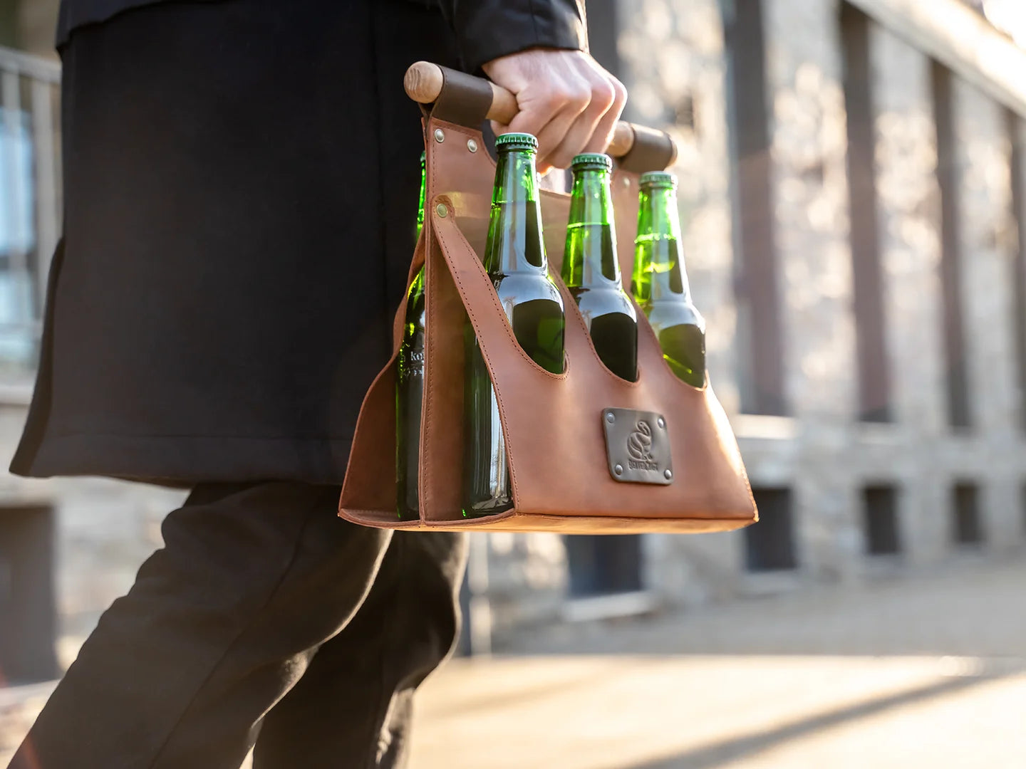 Stílhrein og vönduð leðurtaska fyrir flöskur úr hágæða kúaleðri í klassískum brúnum lit. Fullkominn félagi fyrir grillveislur, ferðalög og gjafir. Hann heldur 6 flöskum eða dósum (0,33–0,5 L) örugglega og með stíl.