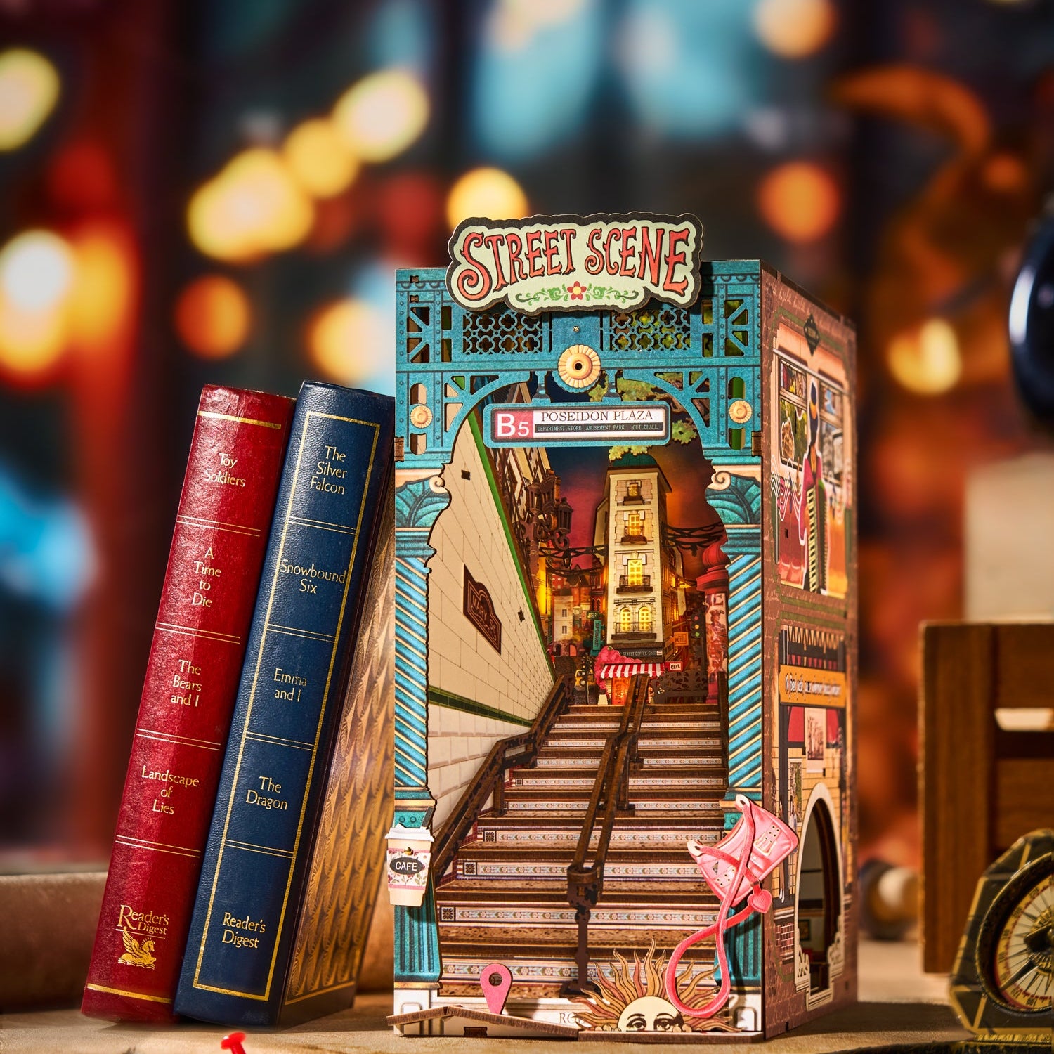 Þetta viðarpúsl sýnir fallega smámynd af líflegri götu með verslunum, skilti og heillandi stemningu. Fullkomið til að setja í bókahillu eða á borð sem skraut sem fær alla til að staldra við.